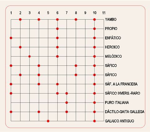La tablilla tiene una grilla de 11 líneas verticales numeradas del 1 al 11 y 12 líneas horizontales, correspondientes cada una a un ritmo de acentuación distinto, con puntos en los lugares en que es lícito colocar los acentos de un verso.