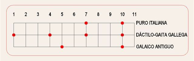 Todos los endecasílabos de este ritmo, sea cual fuere su acentuación, se reducen precisamente a dos estructuras u órdenes de acentos predominantes.