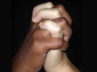 Los dos niños entrelazaron y elevaron las manos para mostrar su amistad.