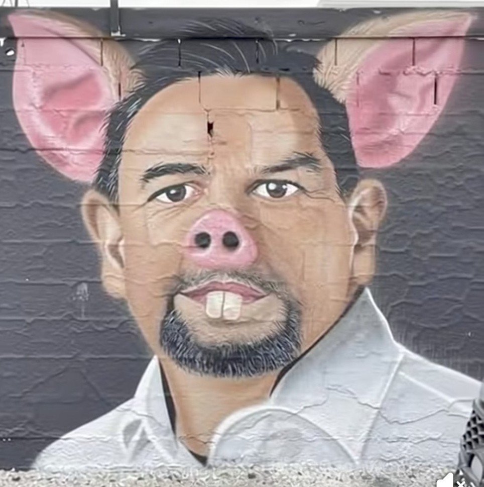 El tal Cruz Pérez Cuellar es de morena desde el año 2016. Los vecinos (los de hoy, hoy, hoy, los de ahora) le mandaron hacer su mural de "cochino" con orejas izquierdosas e incisivos fascistas por su mugrenarca gestión como alcalde que data desde el 2021...