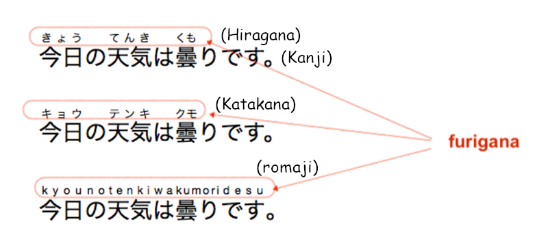 Ayuda para la lectura japonesa de la escritura kanji. Consiste en poner encima y con fuente más pequeña la escritura hiragana correspondiente.