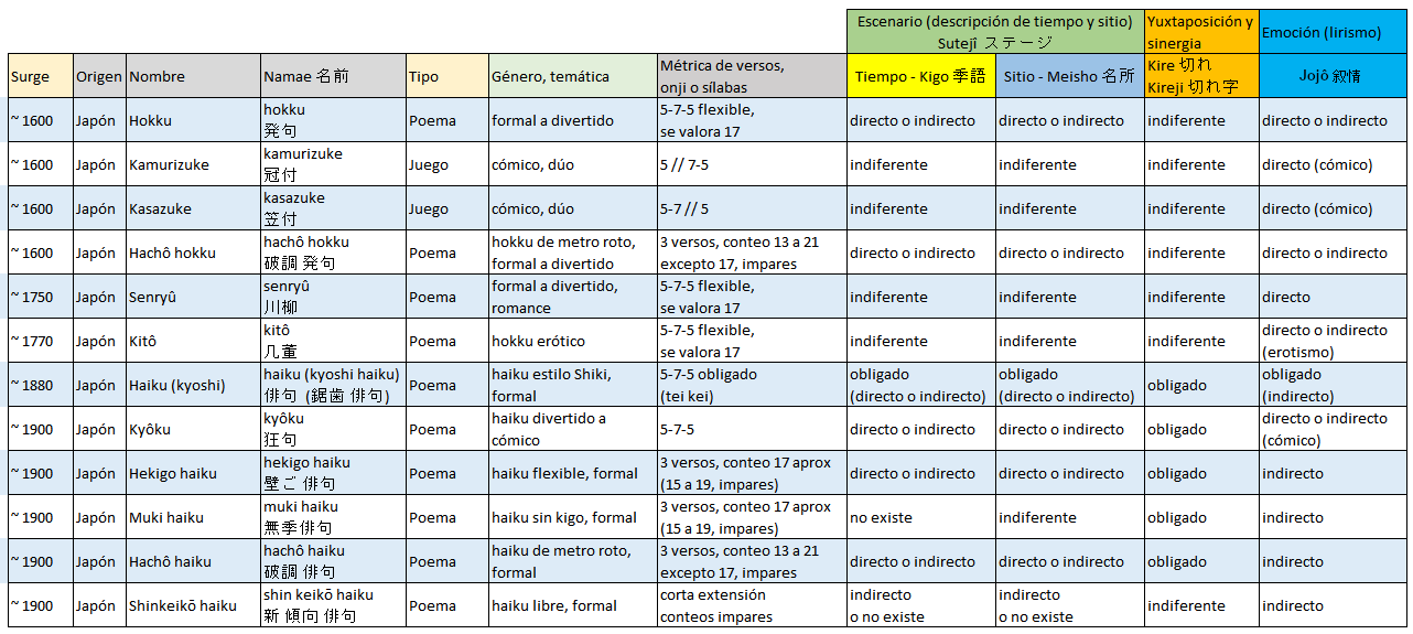 El texto original en esta página ha sido removido para dar paso a un cuadro - resumen de las particularidades que definen y diferencian entre haiku (clásico, tradicional y comtenporáneo), el hokku (haiku clásico), el hacho, el senryu, el shinko haiku (haiku nuevo), y el muki.