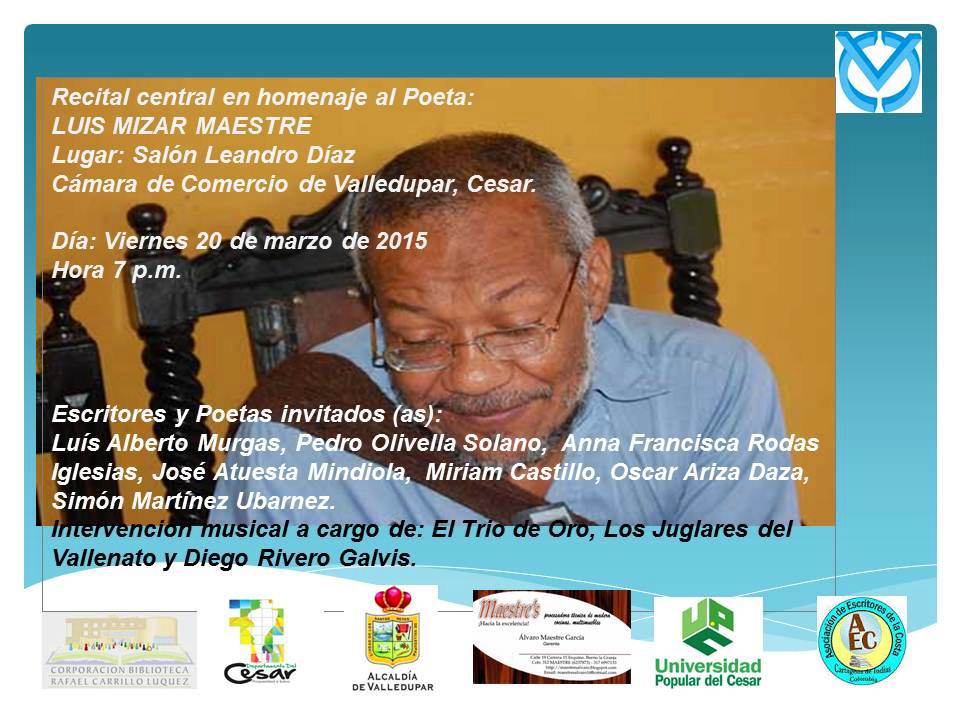 He sido invitada a participar especialmente en este homenaje que se hace a un gran poeta en la ciudad de Valledupar, Cesar, Colombia. Muchas gracias a los organizadores por considerar mi nombre y mi obra para hacer presencia en un momento tan especial del poeta Luis Mizar. Dejo una corta reseña para que le conozcan: