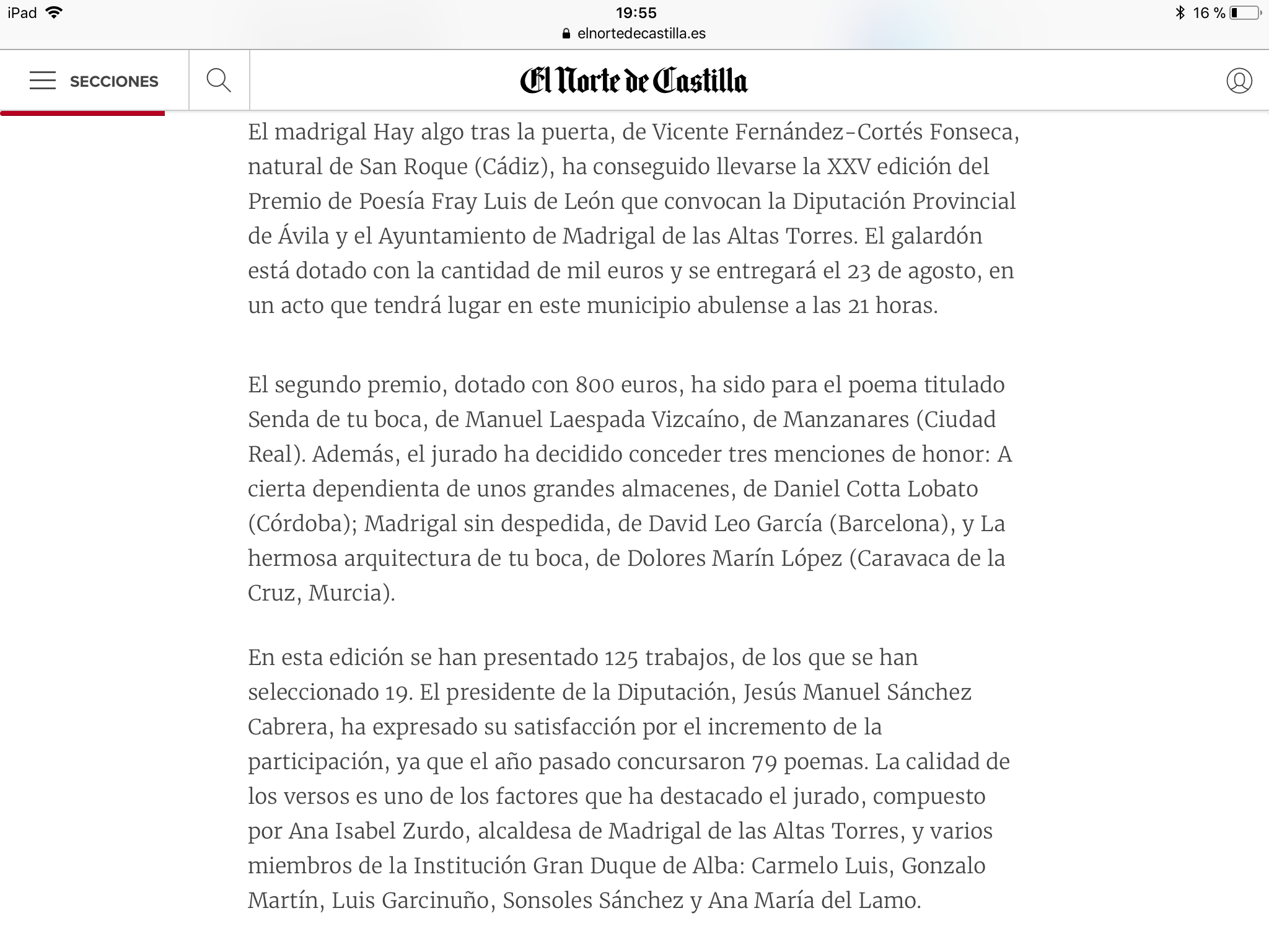 Es verdad que ese premio (a alguien tenían que dárselo) me fue concedido en el verano del 2015 pero esta agradable sorpresa que ahora me brindas para general conocimiento me sabe como si hubiera sido ayer.